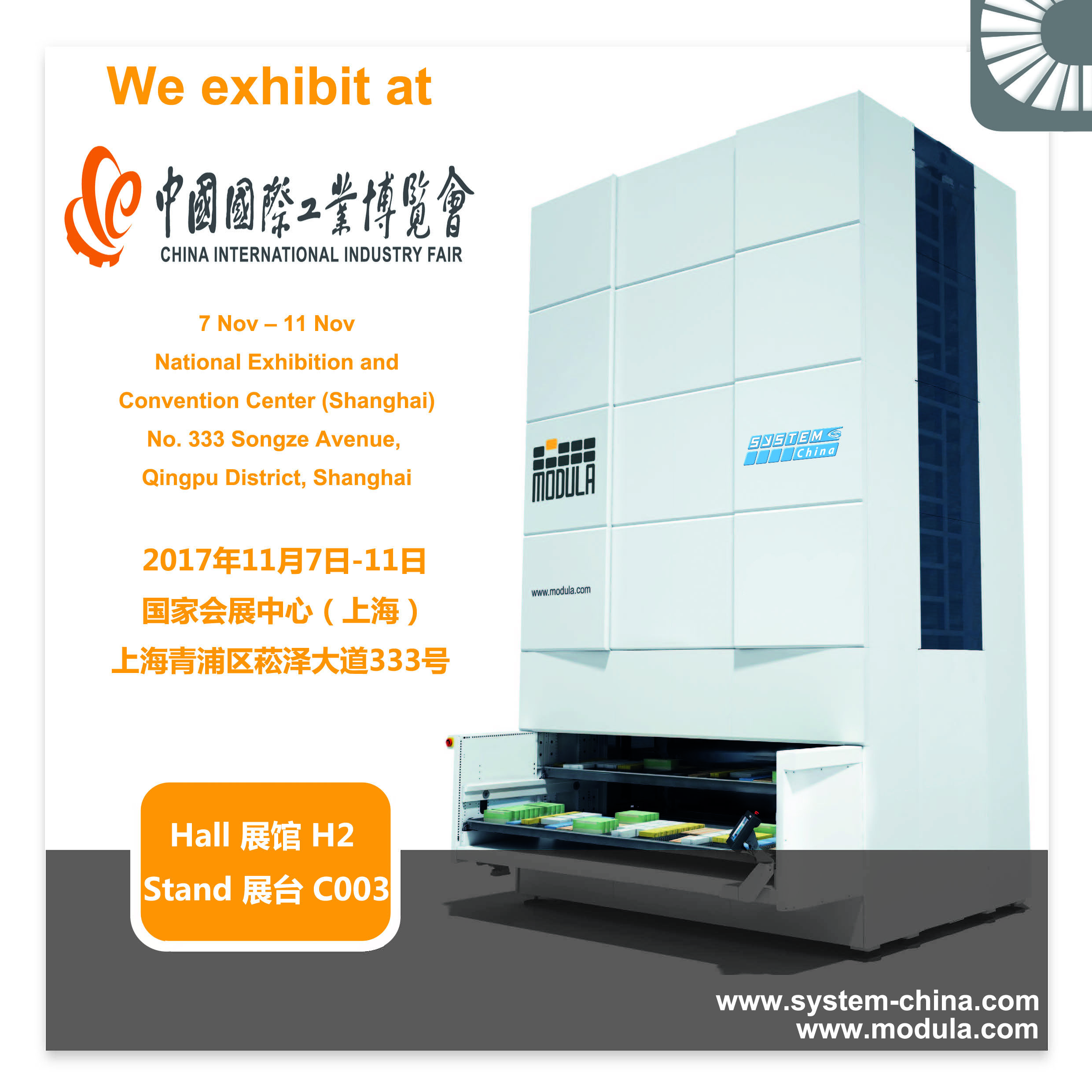 Modula is excited to announce its participation as exhibitor at the upcoming CIIF 2017 , held from 7 November to 11 November in Shanghai.